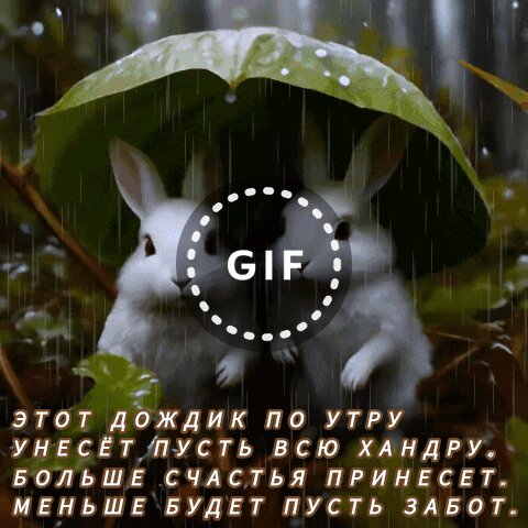 Милая и трогательная картинка с двумя белыми кроликами, которые прячутся под большим зеленым листом во время дождя. Изображение наполнено атмосферой уюта и спокойствия. На картинке присутствует вдохновляющая надпись на русском языке о том, что утренний дождь смоет всю хандру и принесет больше счастья и меньше забот. Идеально подходит для использования в качестве позитивной открытки, статуса в соцсетях или обоев для телефона, чтобы поднять настроение в пасмурный день.