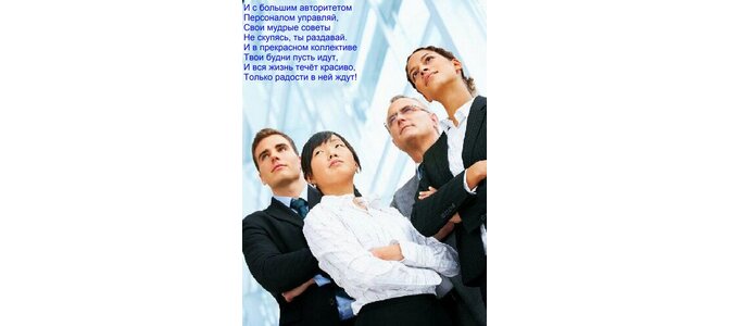 И с большим авторитетом персоналом управляй, свои мудрые советы не скупясь, ты раздавай. И в прекрасном коллективе твои будни пусть идут, и вся жизнь течёт красиво, только радости в ней ждут!