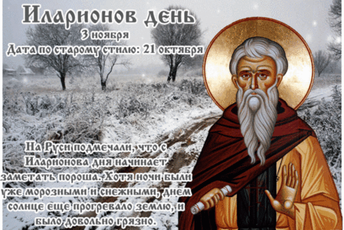 Иларионов день. 3 ноября. Дата по старому стилю: 21 октября. На Руси подмечали, что с Иларионова дня начинает заметать пороша. Хотя ночи были уже морозными и снежными, днем солнце еще прогревало землю, и было довольно грязно.
