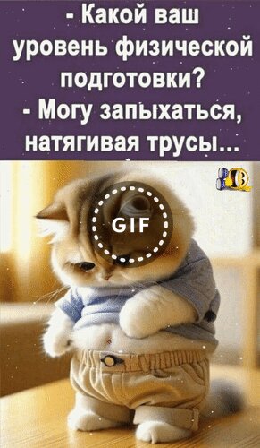 Анимированная открытка "- Какой ваш уровень физической подготовки? - Могу запыхаться, натягивая трусы..."