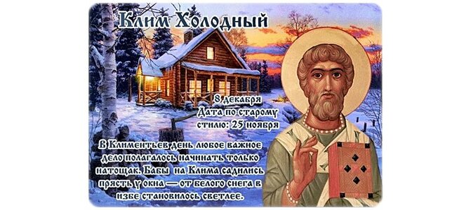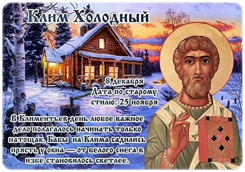 Клим Холодный. Дата по старому стилю: 25 ноября. В Климентьев день любое важное дело полагалось начинать только натощак. Бабы на Клима садились прясть у окна — от белого снега в избе становилось светлее.