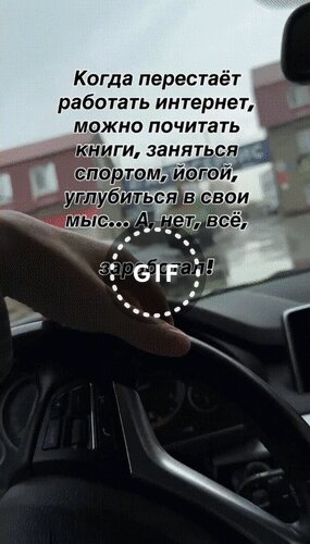 Ироничная вертикальная картинка с текстом на русском языке, расположенная поверх изображения руки водителя на руле автомобиля. Текст гласит: «Когда перестаёт работать интернет, можно почитать книги, заняться спортом, йогой, углубиться в свои мыс… А, нет, всё, заработал!». Изображение передает юмористический взгляд на зависимость современного человека от интернета и мгновенную радость при восстановлении связи. Подходит для использования в социальных сетях как мем на тему технологий, удаленной работы и цифровой жизни.