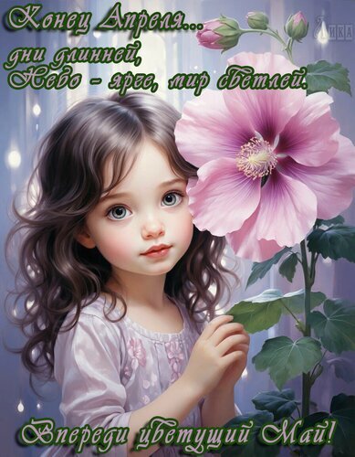 Цифровая иллюстрация в нежных пастельных тонах, изображающая милую девочку с большими выразительными глазами и вьющимися каштановыми волосами. Девочка прижимается к крупному нежно-розовому цветку гибискуса. На изображении присутствует поздравительный текст на русском языке: «Конец Апреля... дни длинней, небо - ярче, мир светлей. Впереди цветущий Май!». Картинка наполнена весенним настроением, светом и теплом, идеально подходит для открыток, поздравлений с наступлением мая и весеннего настроения в социальных сетях.