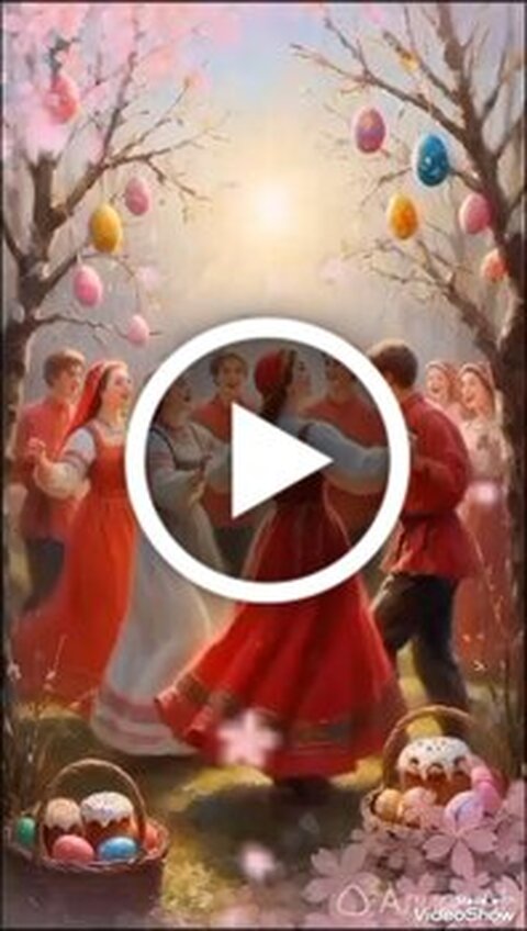 Это видео представляет собой атмосферную праздничную анимацию, посвященную весенним традициям и празднику Пасхи. Сюжет разворачивается в живописном цветущем саду под лучами мягкого солнечного света. Группа молодых людей в красивых традиционных нарядах красного и белого цветов исполняет круговой танец. Вокруг героев парят разноцветные пасхальные яйца, а на переднем плане видны корзины с праздничной выпечкой. Видео наполнено магией и радостью, периодически демонстрируя декоративные элементы в форме светящихся сердец и летящие лепестки цветов. Кадры передают дух единства, весеннего обновления и торжества жизни.
