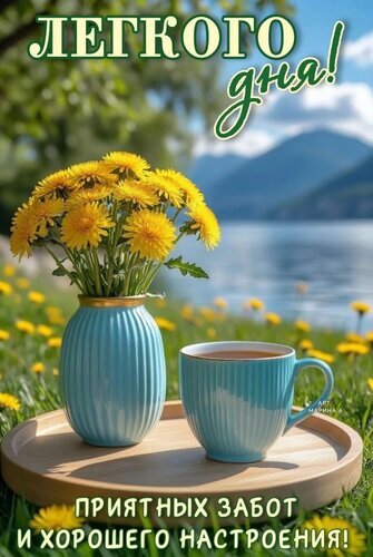 Красивая открытка с пожеланием хорошего дня. На изображении запечатлен уютный натюрморт: букет ярко-желтых одуванчиков в голубой вазе и чашка кофе или чая на деревянном подносе. Фон представляет собой живописный пейзаж с озером и горами под солнечным небом. В верхней части надпись «ЛЕГКОГО ДНЯ!», а в нижней — «ПРИЯТНЫХ ЗАБОТ И ХОРОШЕГО НАСТРОЕНИЯ!». Идеально подходит для отправки друзьям, близким и коллегам в мессенджерах (WhatsApp, Viber) или социальных сетях для поднятия настроения.