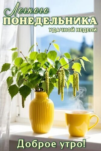 Уютное и вдохновляющее изображение для начала рабочей недели. На светлом подоконнике у окна стоит ярко-желтая ваза с пышными ветками березы и чашка горячего напитка, от которой идет легкий пар. За окном виден мягкий солнечный пейзаж. На картинке размещены поздравительные надписи на русском языке: «Легкого понедельника», «Удачной недели» и «Доброе утро!». Идеально подходит для отправки в мессенджерах и социальных сетях в качестве доброго пожелания коллегам, друзьям и близким для поднятия настроения в понедельник утром.
