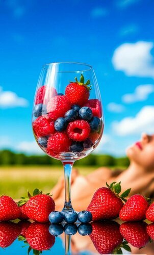 На фоне моря бокал с ягодами.