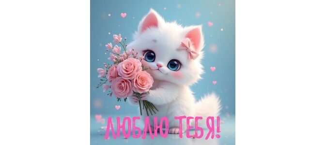 Мультяшный котëночек держит букет роз. Надпись на открытке "Люблю тебя!"