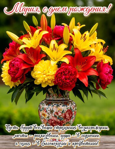 Красивый поздравительный букет из ярких желтых и красных лилий и пышных пионов в изящной фарфоровой вазе. На изображении нанесен текст на русском языке: праздничное поздравление с днем рождения для Марии с теплыми пожеланиями успеха, реализации мечтаний, душевного гармонии и благополучия семьи. Идеальное изображение для открытки, поздравления в мессенджерах или социальных сетях.