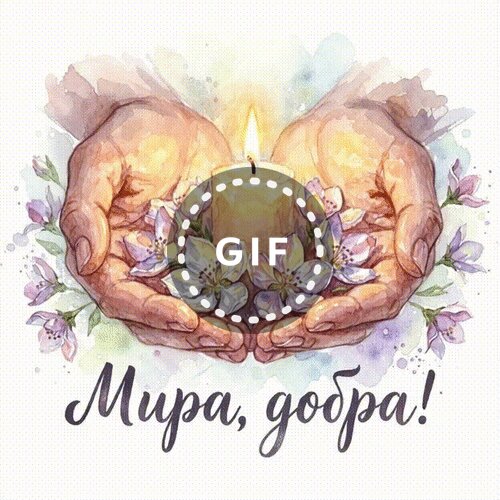 Живописная акварельная иллюстрация, изображающая две ладони, бережно поддерживающие зажженную свечу в окружении нежных весенних цветов. Теплый свет пламени создает атмосферу умиротворения, надежды и духовного тепла. В нижней части изображения расположена надпись на русском языке «Мира, добра!», выполненная изящным каллиграфическим шрифтом. Изображение выполнено в мягких пастельных тонах, что делает его идеальным для открыток, поздравительных сообщений, медитативных постов и тематики душевного спокойствия.