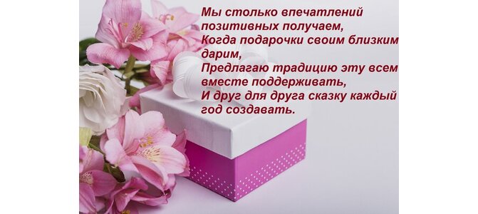 Открытка "Мы столько впечатлений позитивных получаем, Когда подарочки своим близким дарим, Предлагаю традицию"