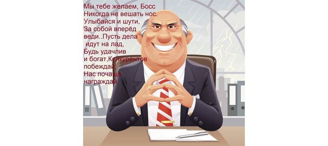 Теги:мы тебе желаем, босс никогда не вешать нос улыбайся и шути, за собой вперёд веди пусть дела идут на лад, будь удачлив и богат, конкурентов побеждай, нас почаще награждай