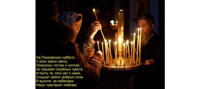 Теги:на покровскую субботу у икон зажги свечу, помолись тотчас с охотой, не скрывая скорбных чувств и пусть те, кого нет с нами, слышат шёпот добрых слов, в высоте, за небесами нашу чувствуют любовь