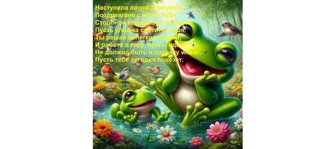 Теги:наступила пятница сегодня, поздравляю с нею я тебя, стороной печали все обходят, пусть, улыбка, светится, твоя, решай, нелегкие, задачи, и работа в гору, идет, не должно быть в пятницу иначе