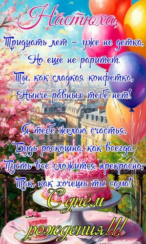 Открытка "Настюха, тридцать лет- уже не детка, но ещё не раритет"