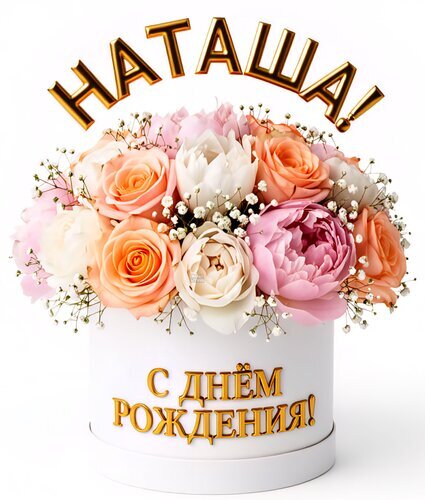 Красивый поздравительный букет в белой подарочной коробке, предназначенный для именинницы по имени Наташа. Композиция состоит из нежных персиковых и розовых роз, пышных пионов и белых цветов, дополненных воздушным гипсофилой. Сверху расположена золотая надпись «НАТАША!», а на коробке — золотистая надпись «С ДНЁМ РОЖДЕНИЯ!». Идеальное праздничное изображение для цифровой открытки или поздравления в мессенджерах.