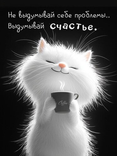 Милая и вдохновляющая цифровая иллюстрация с пушистым белым котом, который с удовольствием пьет горячий кофе. На картинке изображен довольный кот с закрытыми глазами, излучающий спокойствие и умиротворение. Сверху расположен мотивирующий текст на русском языке: " Не выдумывай себе проблемы.. Выдумывай счастье". Изображение выполнено в контрастном стиле: белый пушистый персонаж на глубоком черном фоне. Идеально подходит для использования в качестве обоев на телефон, вдохновляющей картинки для соцсетей, открытки или статуса, транслирующего позитивное мышление и любовь к маленьким радостям жизни.