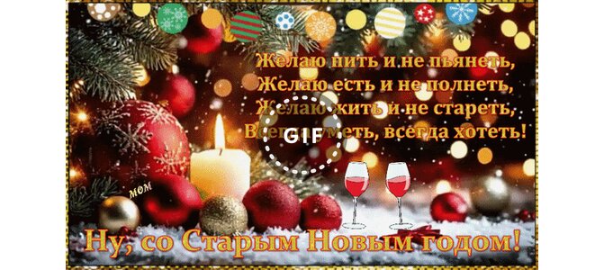 Анимированная открытка "Ну, со Старым Новым годом! Желаю пить и не пьянеть, Желаю есть и не полнеть, Желаю жить и не стареть"