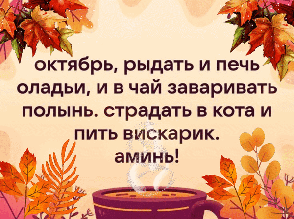 Анимированная открытка "Октябрь рыдать и печь оладьи и в чай заваривать полынь... страдать в кота и ить вискарик. аминь!"