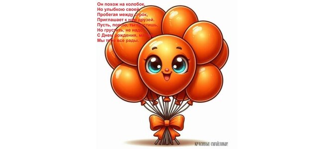 Теги:он похож на колобок, но улыбкою своей, пробегая между строк, приглашает к нам друзей пусть, порою, ты грустишь, но грустить, не надо с днем рождения, малыш, мы тебе все рады