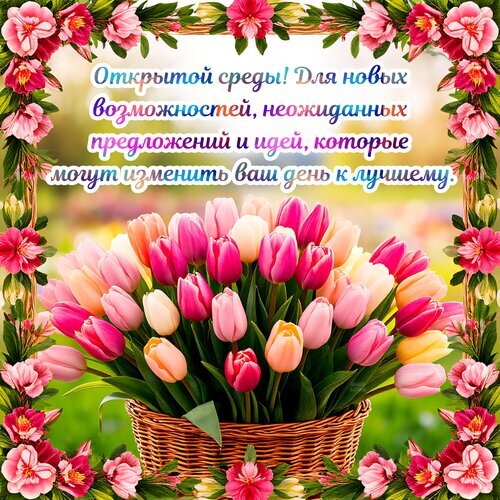 Красочная праздничная открытка с пышным букетом розовых и персиковых тюльпанов в плетеной корзине. Изображение обрамлено нежным венком из цветущей сакуры или вишни. На фоне — мягкий солнечный свет и весенний сад. В центре размещена вдохновляющая надпись на русском языке: «Открытой среды! Для новых возможностей, неожиданных предложений и идей, которые могут изменить ваш день к лучшему». Идеально подходит для поздравлений, пожеланий хорошего дня и создания позитивного настроения в социальных сетях.