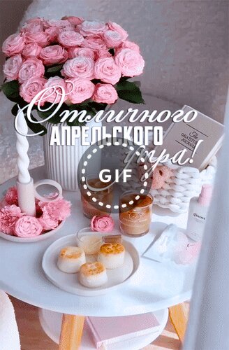 Эстетичная и уютная композиция для доброго апрельского утра. На светлом столе представлен пышный букет нежно-розовых роз в белой вазе, чашки с латте, изысканные десерты и зажженная свеча. Атмосфера весеннего тепла и вдохновения дополнена книгой и декоративными элементами в пастельных тонах. Идеальное изображение для пожелания прекрасного настроения и уютного начала дня.