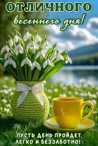 Красивая открытка с пожеланием отличного весеннего дня. На изображении представлен букет нежных подснежников в уютной вязаной вазе с белым бантом, стоящей на зеленой траве. Рядом расположена чашка теплого чая или кофе на блюдце. На фоне виднеется спокойное озеро, горы и весеннее небо с облаками. Атмосфера снимка наполнена свежестью, уютом и радостью пробуждения природы. Идеально подходит для отправки друзьям и близким в качестве позитивного приветствия весной.