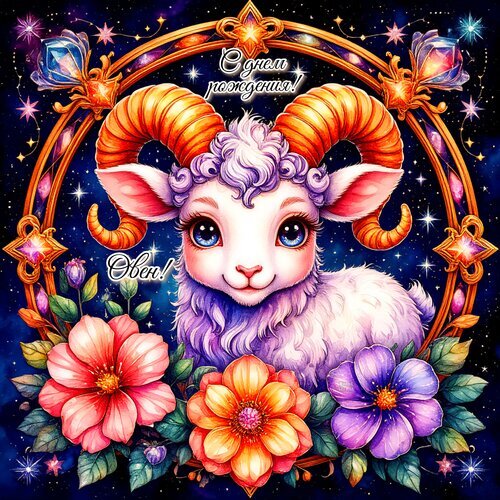 Яркая и сказочная поздравительная открытка с изображением милого ягненка (знака зодиака Овен) в окружении пышных цветов и звездного неба. Иллюстрация выполнена в насыщенных фиолетовых, розовых и золотых тонах. По центру расположена надпись на русском языке «С днем рождения, Овен!». Картинка украшена декоративной золотой рамкой с драгоценными камнями, что создает атмосферу волшебства и праздника. Идеально подходит для поздравления людей, родившихся под знаком Овна, в социальных сетях или мессенджерах.