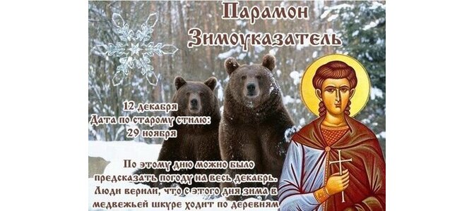 Парамон Зимоуказатель (12 декабря Дата по старому стилю 29 ноября Πο этом дню можно было предсказать погоду на весь декабрь. Люди верили, что с этого для зима в медвежьей шкуре ходит по деревням