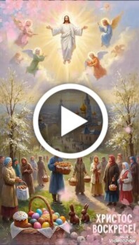 Это праздничное видео посвящено светлому празднику Пасхи и торжеству Воскресения Христова. Сюжет представляет собой величественную и вдохновляющую композицию, где на фоне сияющего неба с изображением Иисуса Христа и ангелов группа верующих собирается у православного храма. Люди несут корзины с пасхальными куличами и крашеными яйцами, празднуя радость вечной жизни. Видео наполнено символизмом, включая летящих белых голубей и золотые сердца, что подчеркивает атмосферу чистоты, любви и духовного обновления. Текстовые поздравления С праздником и Христос Воскресе сопровождают визуальный ряд, создавая торжественное настроение для всех зрителей.
