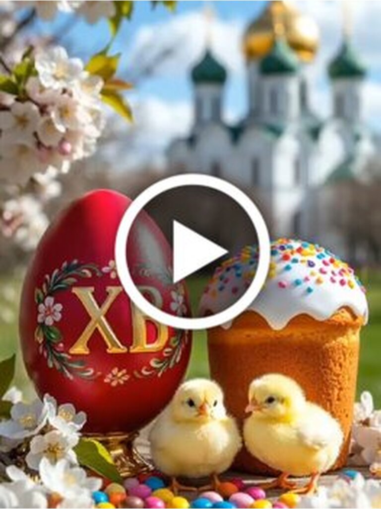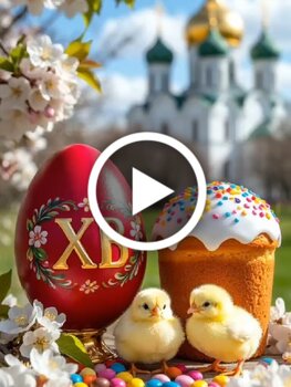 Красивая праздничная видеооткрытка к Пасхе. В кадре представлены традиционные символы светлого праздника: ярко-красное пасхальное яйцо с золотыми буквами ХВ, пышные куличи в белой глазури и пушистые желтые цыплята. Композиция украшена весенними цветами, цветущими ветками и вербой на фоне величественного храма с золотыми куполами. Видео передает атмосферу весеннего пробуждения и радостного торжества.