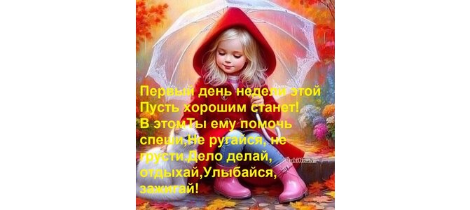 Теги:первый день недели этой пусть хорошим станет в этом ты ему помочь спеши, не ругайся, не грусти дело делай, отдыхай, улыбайся, зажигай