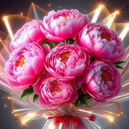 Красивый и роскошный букет из пышных розовых пионов в подарочной упаковке с золотистым блеском. Яркие, сочные цветы крупным планом идеально подходят для оформления поздравлений, открыток, свадебной тематики или создания весеннего настроения. Высококачественное изображение розовых пионов в блестящей обертке с эффектом сияния.