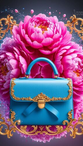 Роскошная композиция, сочетающая элегантность высокой моды и природную красоту. В центре внимания — стильная женская сумка насыщенного небесно-голубого цвета с изысканной золотой отделкой и декоративным ремешком. Фон украшен пышными розовыми пионами, создающими атмосферу нежности и богатства. Вся сцена обрамлена роскошной золотой барочной рамой, что придает изображению художественный, премиальный вид. Идеально подходит для контента о стиле, люксовых аксессуарах и эстетике fashion.