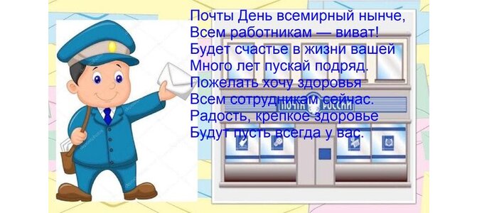 Теги:почты день всемирный нынче, всем работникам виват будет счастье в жизни вашей много лет пускай подряд пожелать хочу здоровья всем сотрудникам сейчас радость, крепкое здоровье будут пусть всегда у вас
