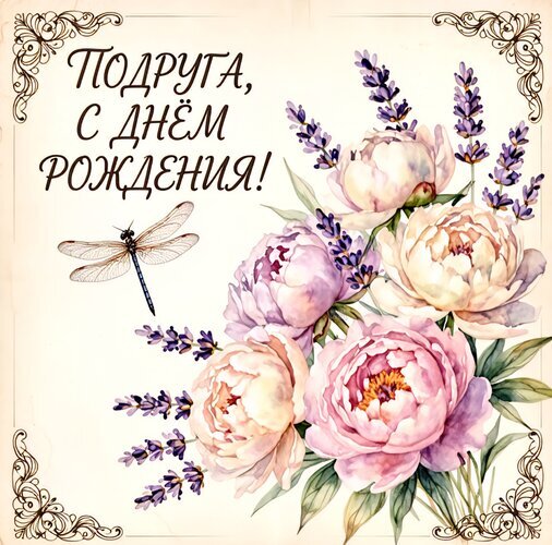 Красивая поздравительная открытка для подруги с надписью «Подруга, с днём рождения!» на русском языке. Изящная композиция в винтажном стиле включает пышные розовые пионы, веточки лаванды и летящую стрекозу. Картинка оформлена декоративной рамкой с узорами и выполнена в нежных пастельных тонах. Идеально подходит для отправки в мессенджерах и социальных сетях как эстетичное цифровое поздравление для близкой женщины или подруги.