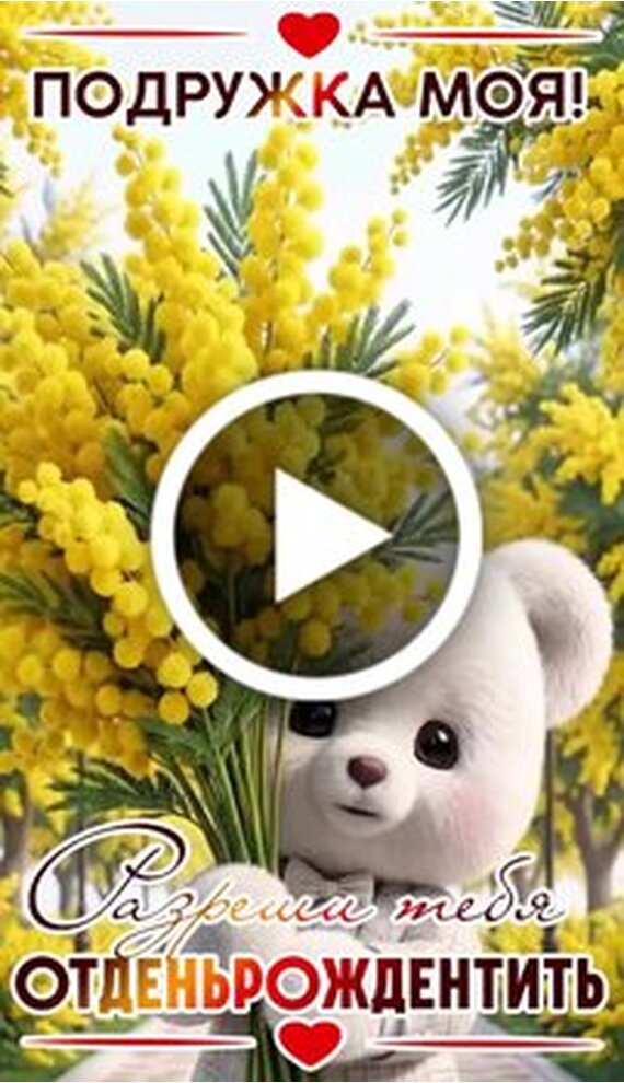 Красивое поздравительное видео для лучшей подруги. В центре сюжета милый белый медвежонок, который держит пышные букеты различных цветов. Видео представляет собой динамичную смену праздничных образов: от ярких желтых мимоз и белых тюльпанов до нежных ландышей, экзотических бабочек, солнечных нарциссов и разноцветных анемонов. Кадры дополнены летящими красными сердцами и праздничным конфетти, создавая атмосферу радости и тепла. Надписи на видео гласят Подружка моя и Разреши тебя отденьрождентить, что делает ролик идеальным способом оригинально поздравить близкую подругу с днем рождения.