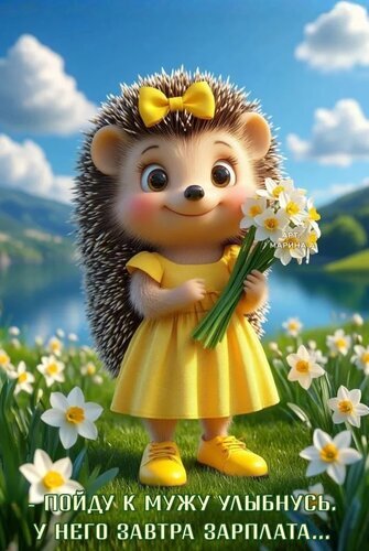 Милая и очаровательная рисованная ежиха в желтом платье и с желтым бантом на голове стоит на цветущей поляне. Она держит в лапках букет белых нарциссов. На фоне — живописный пейзаж с озером, горами и голубым небом с пушистыми облаками. Изображение наполнено солнечным светом и позитивным настроением. В нижней части картинки расположена шуточная надпись на русском языке: «Пойду к мужу улыбнусь. У него завтра зарплата...». Идеально подходит для поздравлений, открыток и поднятия настроения.