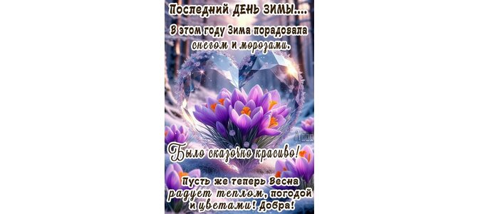 Теги:последний день зимы, зима, цветы, крокусы, красивая картинка, пусть весна порадет, добра, сердечко, позитив, тепла, отличной погоды