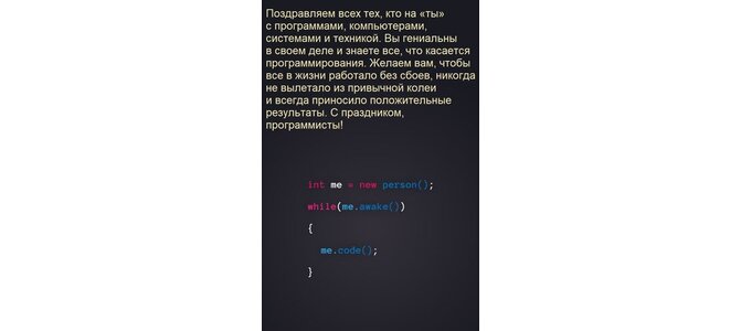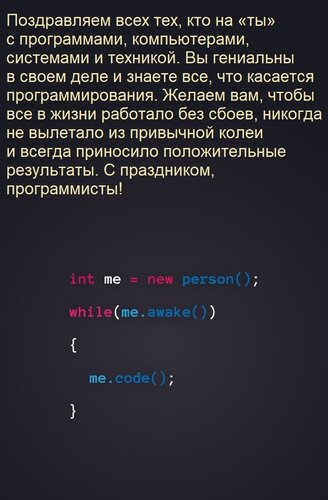 Теги:поздравляем всех тех, кто на ты с программами, компьютерами, системами, техникой, гениальны, своем, деле, знаете, все, что касается программирования желаем вам, чтобы все в жизни работало без сбоев, никогда