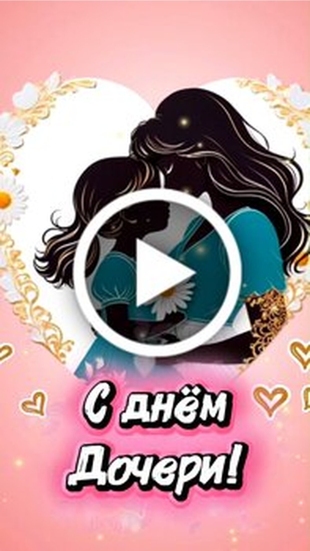 Красивое и трогательное видео поздравление с днем дочери. На фоне нежно-розового цвета с летящими бабочками и золотыми сердцами изображен силуэт матери и маленькой дочери в теплых объятиях. В центре композиции находится белая ромашка. Текст видео выражает самые искренние пожелания счастья, которое пусть никогда не коснется невзгод. Это идеальный видеоролик, чтобы поздравить любимую дочь и подчеркнуть силу материнской любви и нежности отношений между мамой и ребенком.