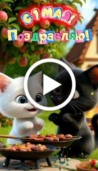 Милое анимационное видео с участием белого и черного котят, посвященное празднованию Первомая. На фоне цветущего сада с яблонями котята наслаждаются пикником с аппетитными шашлыками. Видео содержит теплые пожелания мира, счастья и весны, призывая веселиться, слушать музыку и проводить время с друзьями и семьей. Это яркое и позитивное поздравление идеально подходит для создания праздничного настроения в этот чудесный весенний день.