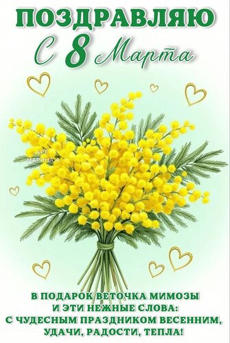Открытка "ПОЗДРАВЛЯЮ С 8 МАРТА. В ПОДАРОК ВЕТОЧКА МИМОЗЫ И ЭТИ НЕЖНЫЕ СЛОВА! С ЧУДЕСНЫМ ПРАЗДНИКОМ ВЕСЕННИМ, У"