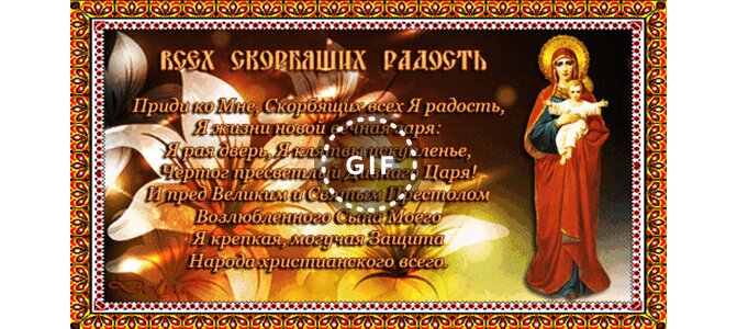 Всех скорбящих Радость. Приди ко мне, скорбящих всех я радость, я жизни новой вечная заря: я рая дверь, я клятвы искупленье, чертог пресветлый дивнаго царя! И пред Великим и Святым Престолом возлюбленного сына моего я крепкая, могучая защита народа христианского всего.