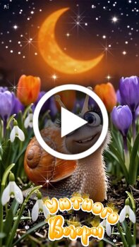 В этом видео вы увидите очаровательную 3D анимацию с милой улыбающейся улиткой на фоне сказочного ночного сада. Сюжет представляет собой спокойную и теплую сцену, где персонаж находится среди ярких тюльпанов и под светящейся полумесяцем звездным небом. Поверх видео накладывается поздравительный текст на русском языке, желающий доброго вечера и самых добрых мыслей. Видео наполнено магической атмосферой и мягким свечением, создавая ощущение уюта и спокойствия.