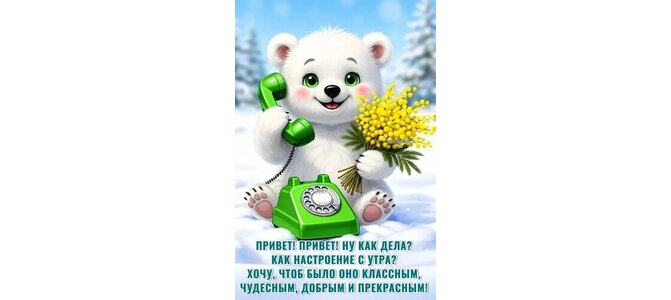Открытка "ПРИВЕТ! ПРИВЕТ! НУ КАК ДЕЛА? КАК НАСТРОЕНИЕ С УТРА? ХОЧУ, ЧТОБ БЫЛО ОНО КЛАССНЫМ, ЧУДЕСНЫМ, ДОБРЫМ И"