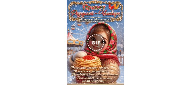 Анимированная открытка "Привет. Разгуляй - Четверг. Широкая Масленица. Разгуляй четверг гуляет и весельем заправляет. Позабу"