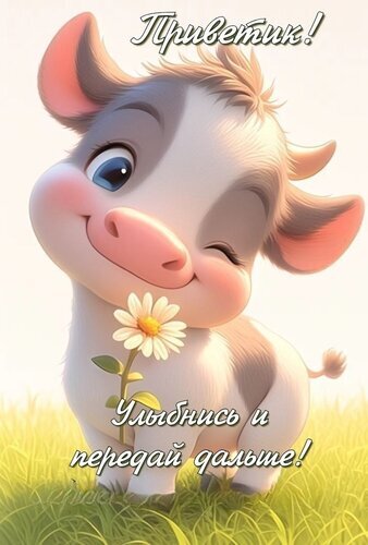Милая и добрая открытка с изображением мультяшного теленка. Маленький белый теленок с розовым носом, большими голубыми глазами и дружелюбной улыбкой стоит на зеленой лужайке и держит в зубах белый цветок ромашки. На картинке расположены надписи на русском языке: «Приветик!» сверху и «Улыбнись и передай дальше!» снизу. Изображение выполнено в мягком, светлом стиле, идеально подходит для отправки друзьям и близким в мессенджерах (WhatsApp, Viber) для поднятия настроения и пожелания доброго дня.