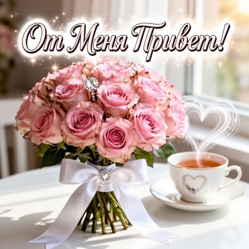 Красивое и нежное изображение для поздравления: пышный букет розовых роз, украшенный белой атласной лентой с блестящей брошью, стоит рядом с чашкой горячего чая. Над букетом каллиграфическая надпись на русском языке «От Меня Привет!». Из чашки поднимается пар, принимающий форму сердца, что создает атмосферу уюта, тепла и романтики. Идеально подходит для отправки близким в качестве душевного приветствия или пожелания доброго утра.