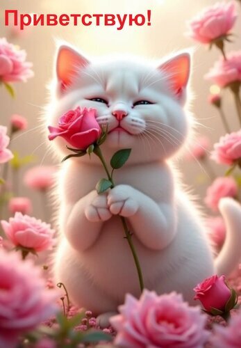 Милое и очаровательное изображение белого пушистого котенка, который нежно прижимается мордочкой к розовой розе. Котенок запечатлен в сказочной атмосфере среди множества цветущих розовых роз, залитых мягким, теплым солнечным светом. Изображение выполнено в стиле цифровой живописи с высокой детализацией меха и лепестков. В верхней части картинки расположена приветственная надпись на русском языке «Приветствую!». Идеально подходит для поздравительных открыток, милых обоев на телефон, тематических постов в социальных сетях и создания позитивного настроения.
